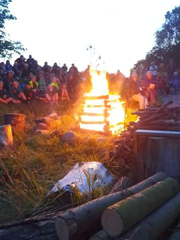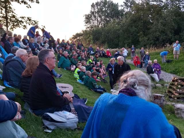 Sitting around the campfire on a hilly environment